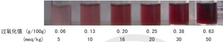 利用食用油氧化所生成的过氧化物与检测试剂发生显色反应,食用油过氧化值越高,颜色越深。