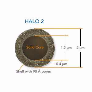 超高柱效:HALO 2 UPLC核壳色谱柱能为您提供30万理论塔板数的超高柱效(比现有非核壳亚2 μm色谱柱更高)。