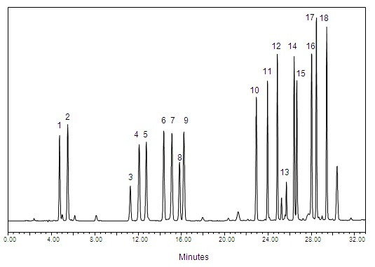 氨基酸专用柱采用ODS键合硅胶为填充剂,填料采用高度可控的单分子层形成和封尾技术制备得到。通过柱前衍生化方法,18种氨基酸在柱上可获得优异的分离。