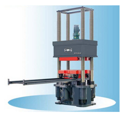 主机采用油缸下置式、四立柱框架式结构,机架刚度强度高,变形小,试验空间无级可调,方便不同高度的试验需求。横梁通过安装其上的螺母与四根丝杠相连,四根丝杠下端安装在底座上,并用螺母紧固,从而构成了受力机构。通过安装在横梁上的电机正反转带动链轮旋转,从而带动螺母转动,实现了横梁的上下移动,使试验空间可以方便地调整。上压板固定在横梁上。油缸及活塞固定在底座的中央,活塞上安装有工作台,下压板通过车轮与导轨相连,这样可轻松实现大型试样的放置。油缸、活塞是主机的主要部分,它们的接触面经过精密加工,使其保持一定的配合间隙和适当的油膜,活塞能够自由移动,而将摩擦减到*低。