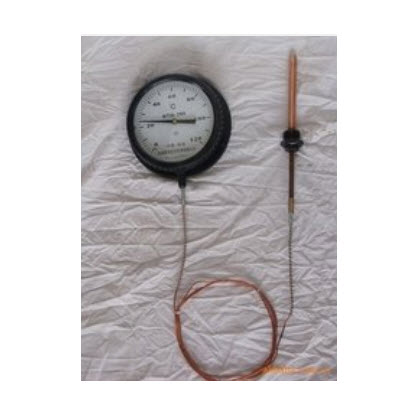 该温度计的原理是基于密闭测温系统内蒸发液体的饱和蒸气压力和温度之间的变化关系,而进行温度测量的。当温包感受到温度变化时,密闭系统内饱和蒸气产生相应的压力,引起弹性元件曲率的变化,使其自由端产生位移,再由齿轮放大机构把位移变为指示值,这种温度计具有温包体积小,反应速度快、灵敏度高、读数直观等特点,几乎集合了玻璃棒温度计、双金属温度计、气体压力温度计的所有优点,它可以制造成防震、防腐型,并且可以实现远传触点信号、热电阻信号、 0-10mA或4-20mA信号。是目前使用范围*广、性能***的一种机械式测温仪表。