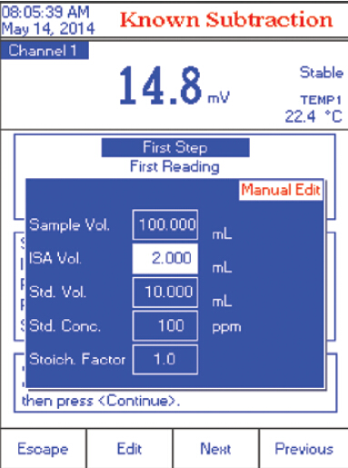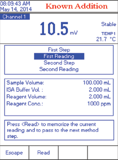 步骤一:输入:样品体积、ISA体积、标准液体积和标准液浓度和系数 (同一批次样品,不需重复此步骤)步骤二: 遵循屏幕提示操作步骤,添加添加已知浓度溶液前后,分别记录mV 读数步骤三:仪器自动显示结果报告,包括详细参数信息。用户可通过HI92000 PC 软件传输或打印数据