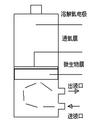 仪器采用微生物电极法,将微生物膜紧贴在极谱式溶解氧电极的透氧膜表面,即构成微生物电极。仪器采用流通测量方式,即样品以流动方式通过微生物电极,如下图所示: