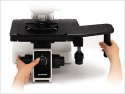 奥林巴斯提供了150mm和100mm两种规格的载物台。150mm载物台带有内嵌离合杆,可以快速地粗调/微调载物台,以对准载物台上的样品,调节时操作人员的双眼无需离开目镜,减少了工作疲劳。(来源:成贯仪器)