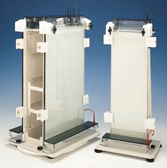 Low-volume sequencers are available in 20cm or 33cm (77/8 or 13") widths and in single and dual gel formats. With the low-profile design to maintain buffer flow through the gel, as little as 250mL of buffer per reservoir is required for the 20cm (77/8") wide unit. The Flip-Lid safety covers cannot be misplaced and allow easy access to the reservoirs. The aluminum heat dispersion plates are anodized for electrical isolation and coated with white epoxy for easy visualization of tracking dyes. Aluminum plates are spring-mounted to reduce clamping stress on glass plates. A clear acrylic bar clamp (included) ensures even compression of the glass plate sandwich to the upper reservoir gasket.